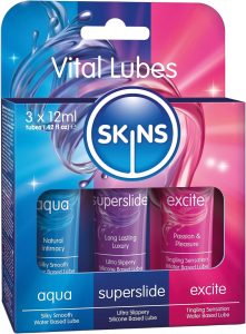 The SKINS Vital Sex Lube Set is more than just a collection of lubricants; it’s a gateway to enhanced pleasure and deeper connection with your partner. Each product within the set has been thoughtfully designed to cater to different preferences and styles of intimacy, ensuring a memorable and enjoyable experience. Whether you’re using it for enhanced sexual pleasure, solo exploration, or a sensual massage, our range of lubricants will help you create lasting moments of joy. Discover the magic of SKINS lubricants today and take your intimate experiences to new heights!
