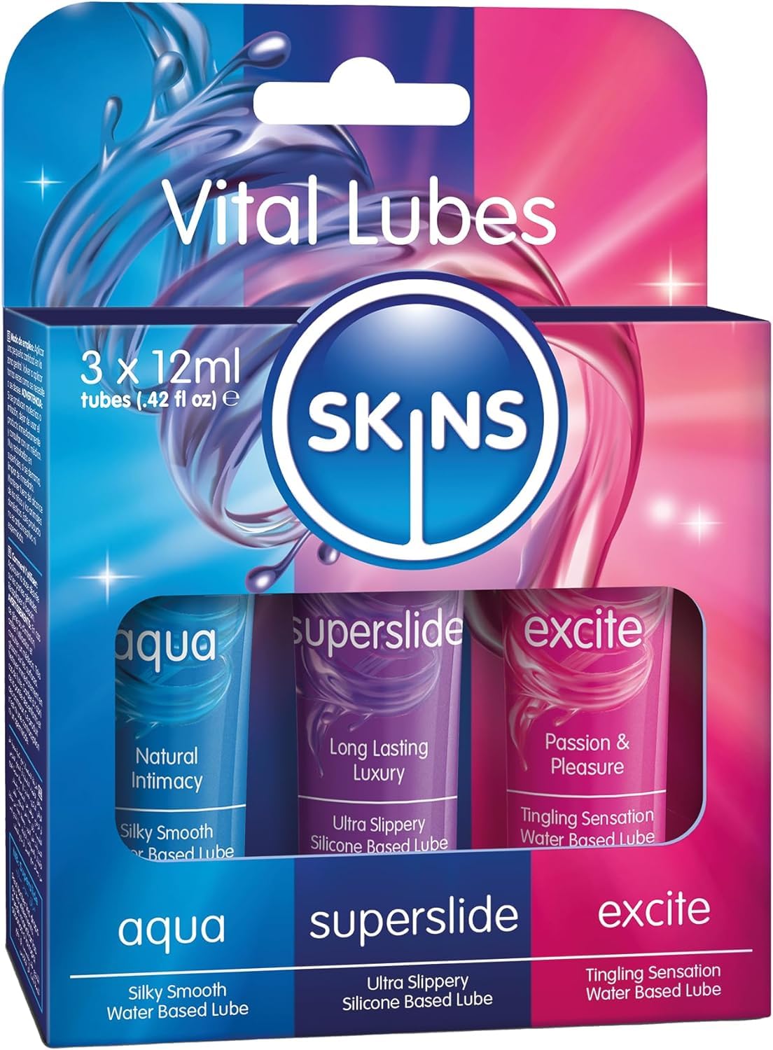 The SKINS Vital Sex Lube Set comes with three expertly crafted lubricants in 12ml tubes, perfect for trying out each type without committing to full-sized products. Each lubricant serves a unique purpose, catering to your varied needs and preferences during intimate moments.